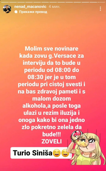 – Molim sve novinare kada zovu g. Versaće za intervju da to bude u periodu od 08:00 do 08:30 jer je u tom periodu pri čistoj svesti i na baš zdravoj pameti i s malom dozom alkohola, a posle toga ulazi u režim iluzija i onoga kako bi ona jedno zlo pokretno želela da bude! Živeli! Turio Siniša – napisao je Bebica.