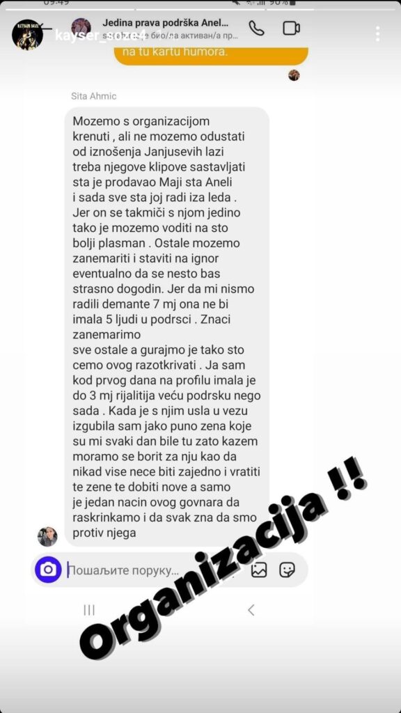 “Mozemo s organizacijom krenuti, ali ne mozemo odustati od iznosenja Janjusevih lazi. Treba njegove klipove sastavljati sta je prodavao Maji sta Aneli i sada sve sta joj radi iza ledja. Jer on se takmici sa njom. Jedino tako je mozemo voditi na sto bolji plasman. Ostale mozemo zanemariti i staviti na ignor eventualno da se nesto bas strasno dogodi. Jer da mi nismo radili demante 7 meseci, ona ne bi imala 5 ljudi u podrsci.” Napisala je Anelina sestra i dodala: