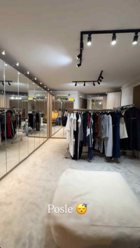 Celim garderoberom protežu se ogledala, dok se u centru nalazi štender sa garderobom Sekinog modnog brenda.