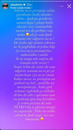 – Inboks mi je pretrpan vašim porukama kada ulazim i slično, ljudi po gradu me zaustavljaju i pitaju kada ulazim viču iz automobila moraš uci da prebijes onu stoku a ali ja vam ljudi nemam vise odgovor na to. Da Luka nije unutra iskreno ne bi pogledala ni jedan klip jer ovo mi je presmiješno, nakaradno i ostalo. Ja ne mogu niti smijem da iznosim neke stvari. Samo želim da znate da vam odgovor nemam na to jer ja nisam krpa i ja za ne znam za kakav novac ne pristajem na gadosti, na laži, podršku na manipulaciju. Kako god nekome izgledalo ja itekako držim do sebe i spremna sam na poštenu igru. Moj karakter je svima poznat da sam neko ko je glasan mnogo na nepravdu. Tako da toliko od mene ljudi moji i na ovu limunadu -rekla je Sita.