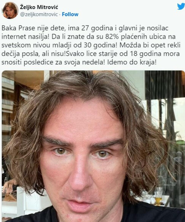 – Baka Prase nije dete, ima 27 godina i glavni je nosilac internet nasilja! Da li znate da su 82 posto plaćenih ubica na svetskom nivou mladji od 30 godina! Možda bi opet rekli dečija posla, ali nisu!Svako lice starije od 18 godina mora snositi posledice za svoja nedela! Idemo do kraja! – napisao je Mitrović.