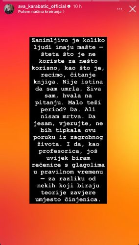 – Zanimljivo je koliko ljudi imaju mašte – šteta što je ne koristite za nešto korisno, kao što je, recimo, čitanje knjiga. Nije istina da sam umrla. Živa sam, hvala na pitanju. Malo teži period? Da. Ali nisam mrtva. Da jesam, verujte, ne bih tipkala ovu poruku iz zagrobnog života. I da, kao profesorka, još uvek biram rečenice s glagolima u pravilnom vremenu – za razliku od nekih koji biraju teorije zavere umesto činjenica – napisala je Ava Karabatić.