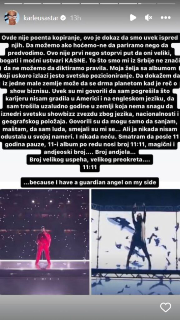 Uporedivši sebe s njom, Karleuša je istakla je kako je čitav spektakl koji je svet pratio – „dokaz da smo uvek bili ispred njih“. Iako iz „male zemlje“, ona svakako planira da „prodrma planetu“, a u tome će joj pomoći novi album koji po njenom mišljenju već nosi zanimljivu simboliku, iako još uvek nije ugledao svetlost dana.