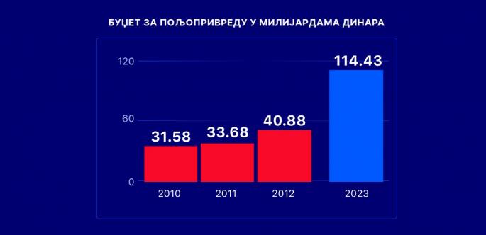 Koliko ova vlast pod vođstvom predsednika Aleksandra Vučića brine o srpskoj poljoprivredi najbolje govori činjenica da je su budžetska sredstva za tu granu privrede tri puta veća nego što su bila 2012. godine i iznose skoro 115 milijardi dinara.