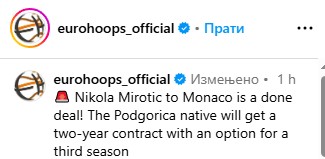Ove informacije donosi Eurohoops, a još ranije se pominjalo da će Mirotić da promeni sredinu i da Milano zameni Monte Karlom.