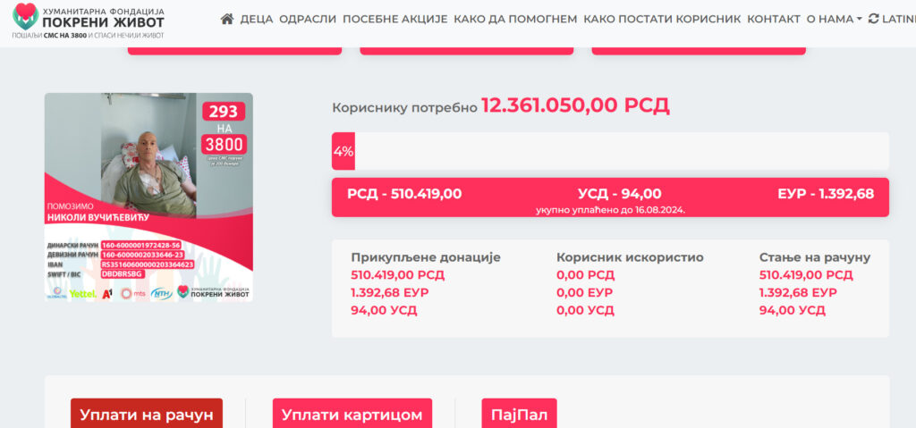 Humanitarna fondacija „Pokreni život“ nudi sledeće opcije: za Nikolin život možete poslati broj 293 na 3800. Cena SMS poruke je 200 dinara.