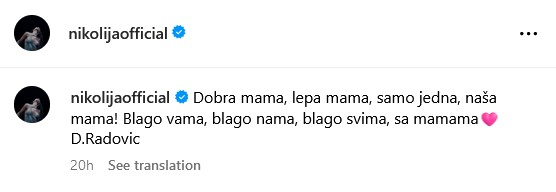 – Dobra mama, lepa mama, samo jedna, naša mama! Blago vama, blago nama, blago svima, sa mamama – napisala je Nikolija ispod objave.