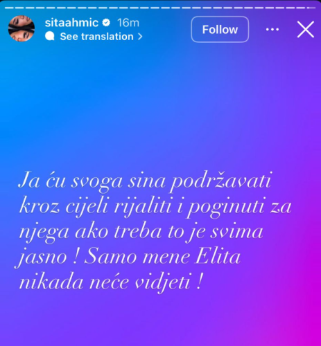 – Ja ću svog sina podržati kroz celi rijaliti i poginuti za njega, ako treba i to je svima jasno! Samo mene rijaliti nikada neće videti – napisala je Sita.