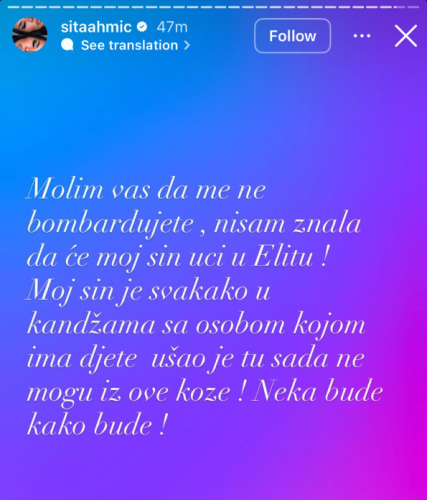 – Molim vas da me ne bombardujete, nisam znala da će moj sin ući u rijaliti! Moj sin je svakako u kandžama sa osobom sa kojom ima dete. Ušao je tu, sada ne mogu iz ove kože! Neka bude kako bude! – napisala je ona, pa nastavila: