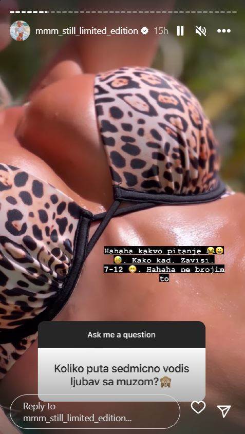 „7-12 puta nedeljno, odakle tvom mužu toliki libido? Nek pozajmi malo mom, sretnice“, poručila joj je jedna od obožavateljki, a Milica joj je odgovorila: „Hahaha pa ne znam… Ja mislim da je to normalna količina„.