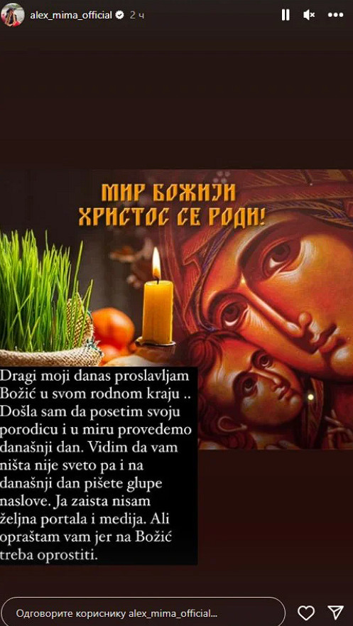 – Dragi moji, danas proslavljam Božić u svom rodnom kraju. Došla sam da posjetim svoju porodicu i u miru provedemo današnji dan. Vidim da vam ništa nije sveto, pa i na današnji dan pišete glupe naslove. Ja zaista nisam željna portala i medija. Ali opraštam vam jer na Božić treba oprostiti – poručila je Aleksandra.