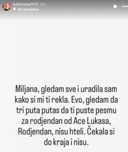 – Miljana, sve sam gledala i uradila kako si mi rekla. Tri puta sam pokušala da ti puste pesmu ‘Rođendan’ od Ace Lukasa, nisu hteli. Čekala si do kraja, ali nisu je pustili. Znam koliko ti je to značilo… – napisala je Marija na Instagramu.