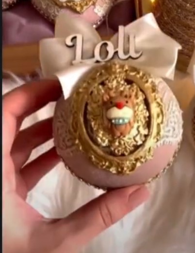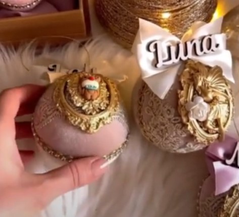 U pitanju su puderasto roze kugle sa bogatom zlatnom dekoracijom i satenskim mašnama sa imenima svakog člana porodice.