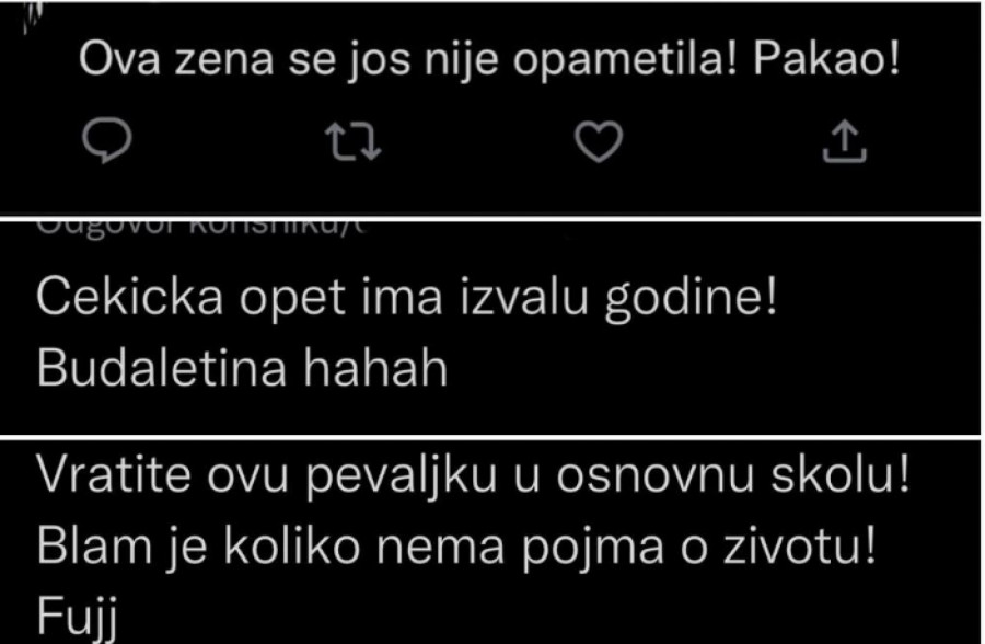 – Ova žena se još nije opametila! Čekićka opet ima izvalu godine! Budaletina! Vratite ovu pevaljku u osnovnu školu! Blam koliko ova Čekićka nema pojma o životu! – samo su neki od komentara.