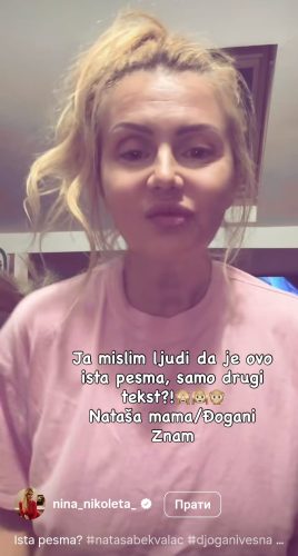 -Ja mislim, ljudi, da je ovo ista pesma, samo drugi tekst?! Nataša — ‘Mama’, Vesna — ‘Znam ja’! — napisala je Nikoleta, uz video kolaž u kojem je spojila dve numere, označivši i Bekvalčevu i Đogani u objavi.