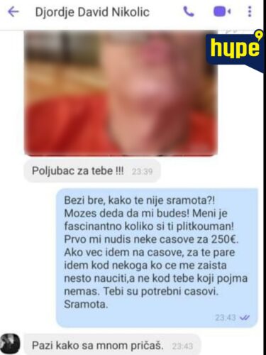 – Beži, bre, kako te nije sramota? Možeš deda da mi budeš! Meni je fascinantno koliko si ti plitkouman. Prvo mi nudiš neke časove za 250 evra. Ako već idem na časove, za te pare idem kod nekoga ko će me zaista nešto naučiti, a ne kod tebe, koji pojma nemaš. Tebi su potrebni časovi. Sramota.