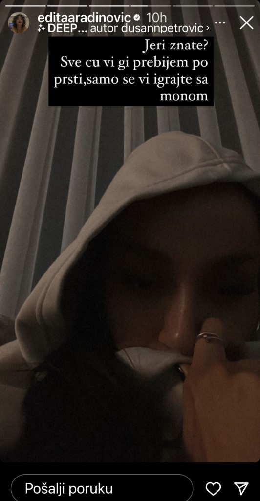 – Jeri znate? Sve ću vi gi prebijem po prsti, samo se vi igrajte sa monom – napisala je pevačica.