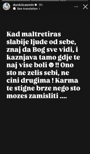 „Kad maltretiras slabije ljude od sebe, znaj da Bog sve vidi, i kaznjava tamo gdje te naj vise boli!! Ono sto ne zelis sebi, ne cini drugima! Karma te stigne brze nego sto mozes zamisliti….“, napisao je Asmin.