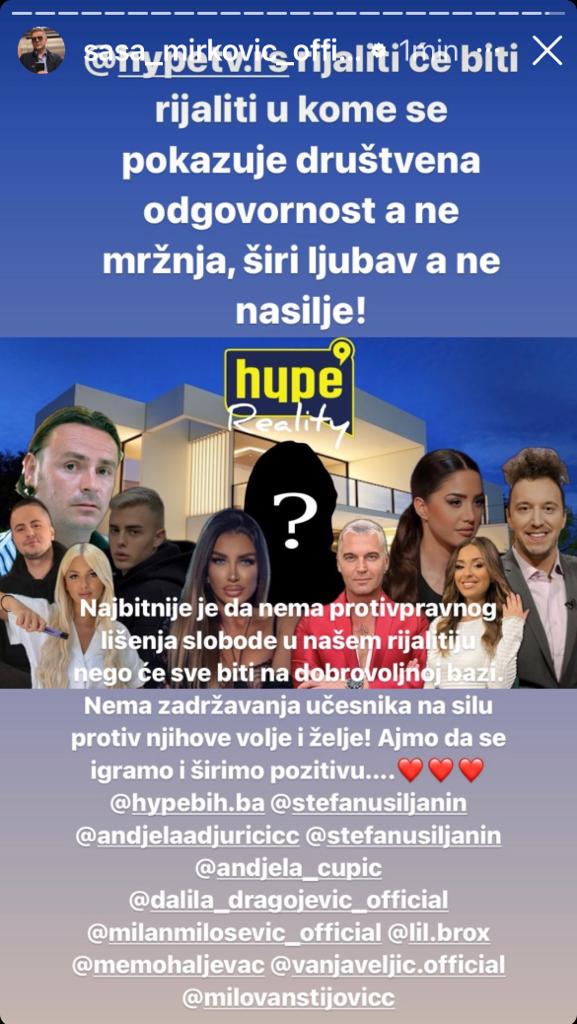 – HYPE rijaliti će biti rijaliti u kome se pokazuje društvena odgovornost, a ne mržnja, širi ljubav, a ne nasilje! – napisao je na početku Saša, pa dodao: