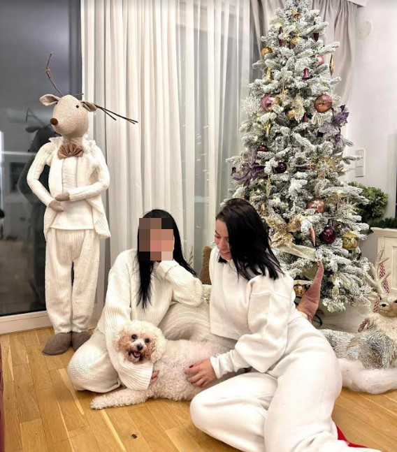 Na fotografiji u njihovom domu, Katarina je pozirala sa sestrom i psom, dok se u pozadini nalazi novogodišnja dekoracija, i jelka ukrašena raznobojnim ukrasima.