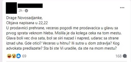 „U prodavnici prehrane, večeras pogodi me prodavačica u glavu sa prvog sprata veknom hleba. Mislila je da kolega čeka na tom mestu. Glava boli već dva sata, bol se širi nazad i napred, udarac sa strane iznad uha. Gde otići? Večeras u hitnu? Ili sutra u dom zdravlja? Kog advokata predlažete? Šta biste vi uradile da ste na mom mestu?“, napisala je ozlojeđena Novosađanka i odmah izazvala lavinu komentara.