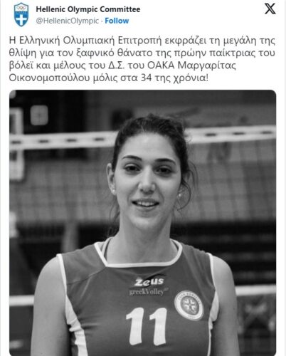 Smrt ju je zadesila na mestu zamenice predsednika odbora za upravljanje sportskim kompleksom Olimpijskog stadiona u Atini (OAKA).