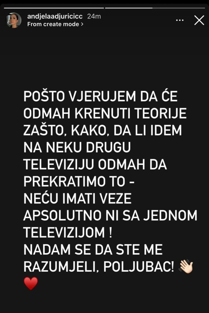 -Ćao ljudi, znate da nisam aktivna već neko vrijeme na Instagramu, pa mi redovno šaljete poruke šta se dešava samnom. Da li radim i dalje pošto me niste odavno vidjeli na Hype televiziji. Ovim putem želim da vas obavestim da je moja saradnja sa Hype produkcijom završena iz meni poznatih razloga. Volim vas, ljubim i ne brinite za mene – napisala je Anđela, pa dodala: