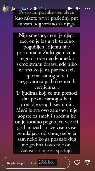 – Pošto mi poruke već uleću kao rakete, prvi i poslednji put ću vam odgovoriti vezano za njega. Nije smešno, meni je njega žao, on je još uvek totalno pogubljen i njemu nije potrebna ni Zadruga, ni žene, nego da ode negde u neku skroz stranu državu gde niko ne zna ko je na par meseci, upozna samog sebe i razgovara sa psiholozima ili vernicima, tj. ljudima koji će mu pomoći da upozna samog sebe i pronađe svoj duševni mir. Meni je sve ovo žalosno i nije za smeh i sprdnju, jer on je totalno pogubljen već tri godine unazad. I sve više i više se udaljava od samog sebe, ja sam neko ko ga poznaje dugi niz godina i ovo nije on – napisala je Jelena na Instagramu.