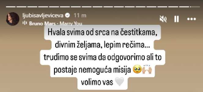 – Hvala svima od srca na čestitkama, divnim željama, lepim rečima… Trudimo se svima da odgovorimo, ali to postaje nemoguće misija. Volimo vas – napisala je Jovana na Instagram profilu.