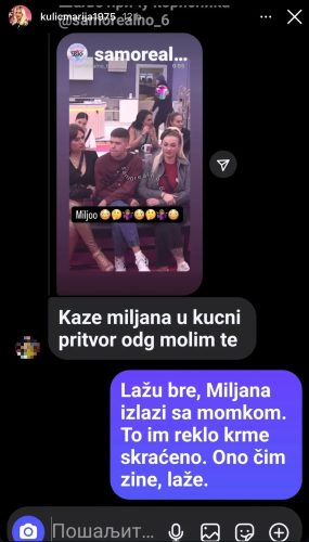 „Lažu bre, Miljana izlazi sa momkom. To im reklo krme skraćeno. On, bre, laže čim zine„, napisala je Marija.