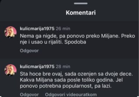 „Šta hoće bre ovaj, sada oženjen sa dvoje dece. Kakva Miljana sada posle toliko godina. Jel ponovo potrebna popularnost, pa laži“.