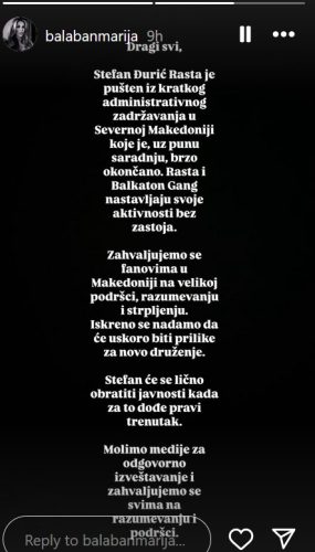 – Stefan Đurić Rasta je pušten iz kratkog administrativnog zadržavanja u Severnoj Makedoniji koje je, uz punu saradnju, brzo okončano. Rasta i Balkaton Gang nastavljaju svoje aktivnosti bez zastoja. Zahvaljujemo se fanovima u Makedoniji na velikoj podršci, razumevanju i strpljenju. Iskreno se nadamo da će uskoro biti prilike za novo druženje. Stefan će se lično obratiti javnosti kada za to dođe pravi trenutak. Molimo medije za odgovorno izveštavanje i zahvaljujemo se svima na razumevanju i podršci. Vaš Balkaton Gang – piše u saopštenju njegovog tima, koje je i ona objavila na pomenutoj društvenoj mreži.