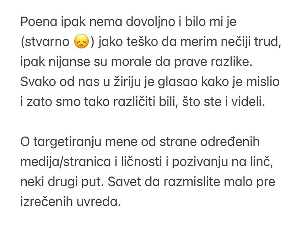 Nakon proglašenja pobednika ona se susrela sa pohvalama ali i uvredama zbog toga što je Breskvici dala 0 bodova. Sada je oglasila na svom Instagram nalogu gde je sumirala utiske sa ovog takmičenja: