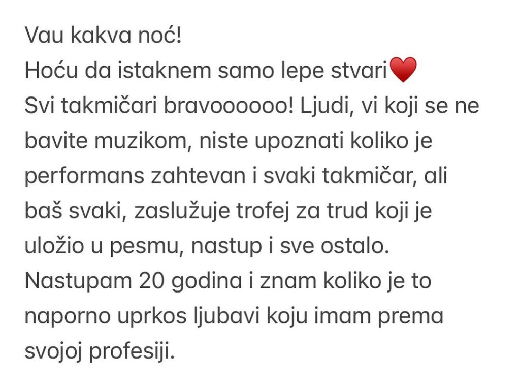 – Vau kakva noć! Hoću da istaknem samo lepe stvari. Svi takmičari bravoooooo! Ljudi, vi koji se ne bavite muzikom, niste upoznati koliko je performans zahtevan i svaki takmičar, ali baš svaki, zaslužuje trofej za trud koji je uložio u pesmu, nastup i sve ostalo. Nastupam 20 godina i znam koliko je to naporno uprkos ljubavi koju imam prema svojoj profesiji. Poena ipak nema dovoljno i bilo mi je (stvarno) jako teško da merim nečiji trud.Ipak nijanse su morale da prave razlike. Svako od nas u žiriju je glasao kako je mislio i zato smo tako različiti bili, što ste i videli. O targetiranju mene od strane određenih medija/stranica i ličnosti i pozivanju na linč, neki drugi put. Savet da razmislite malo pre izrečenih uvreda. Uživajte u muzici i umetnosti, Teya, u maju te pratimo u Malme i navijamo!– napisala je ona na svom instagram profilu.