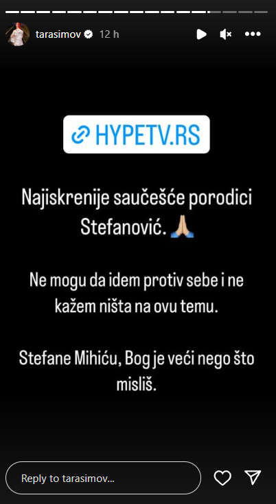 – Najiskrenije saučešće porodici Stefanović. Ne mogu da idem protiv sebe i ne kažem ništa na ovu temu. Stefane Mihiću, Bog je veći nego što misliš – napisala je Tara na svom Instagram storiju.