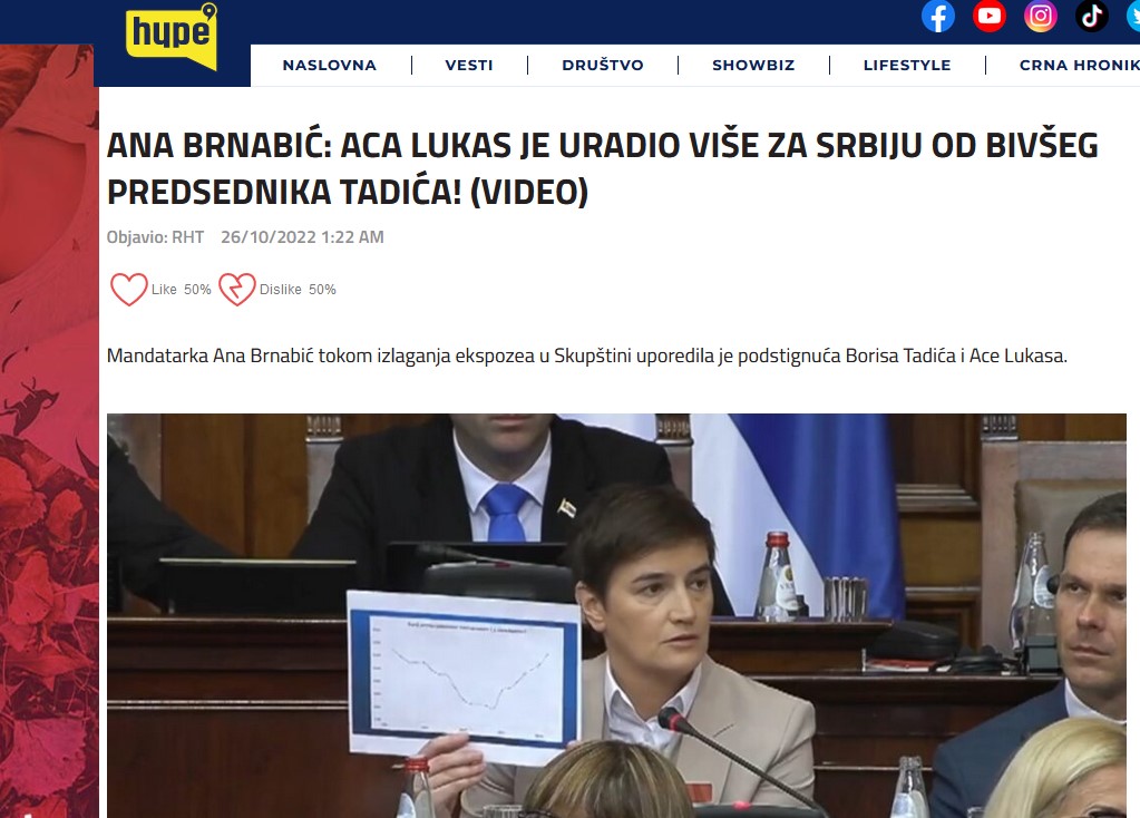 Naime, tokom izlaganja ekspozea Ani Brnabić je neko od opozicionih poslanika dobacio opasku na račun Ace Lukasa i njenog gostovanja u emisiji “Hit Tvit”, na čega je Ana reagovala odgovorivši da je Lukas uradio više za Srbiju od bivšeg predsednika Tadića.