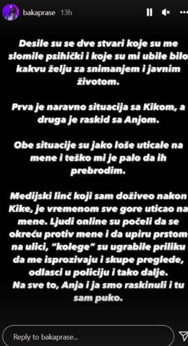– Desile su se dve stvari koje su me slomile psihički i koje su mi ubile bilo kakvu želju za snimanjem i javnim životom. Prva je, naravno, situacija sa Kikom, a druga je raskid sa Anjom. Obe situacije su jako loše uticale na mene i teško mi je palo da ih prebrodim. Medijski linč koji sam doživeo nakon Kike je vremenom sve gore uticao na mene. Ljudi onlajn su počeli da se okreću protiv mene i da upiru prstom na ulici, „kolege“ su ugrabile priliku da me isprozivaju i skupe preglede, odlasci u policiju i tako dalje. Na sve to, Anja i ja smo raskinuli, i tu sam puk’o – napisao je jutjuber.