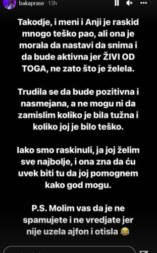 – Takođe, i meni i Anji je raskid mnogo teško pao, ali ona je morala da nastavi da snima i da bude aktivna jer živi od toga, ne zato što je želela. Trudila se da bude pozitivna i nasmejana, a ne mogu da zamislim koliko je bila tužna i koliko joj je bilo teško. Iako smo raskinuli, ja joj želim sve najbolje, i ona zna da ću uvek biti tu da joj pomognem kako god mogu. P.S. Molim vas da je ne spamujete i ne vređate jer nije uzela ajfon i otišla – naveo je potom.