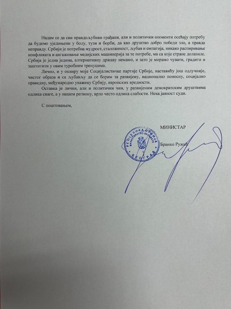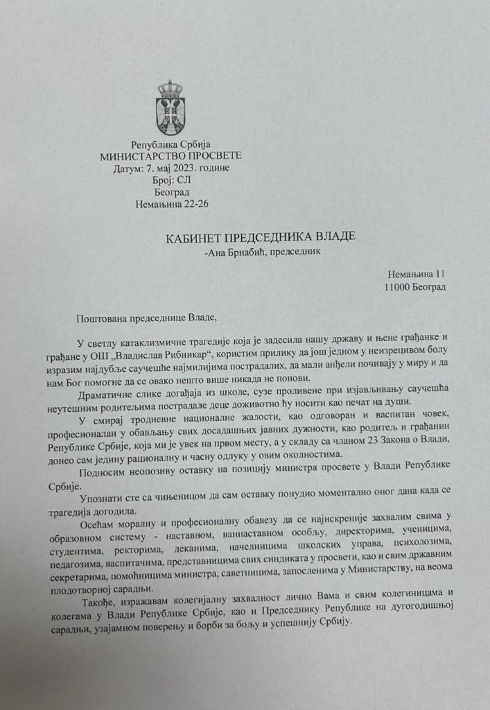Ministar prosvete Branko Ružić je neopozivu ostavku dao nakon tragedije koja se prošle nedelje, u sredu, 3. maja dogodila u Osnovnoj školi „Vladislav Ribnikar“ kada je učenik sedmog razreda K. K. (13) ubio 8 učenika i čuvara škole, a ranio još 6 đaka i nastavnicu istorije.