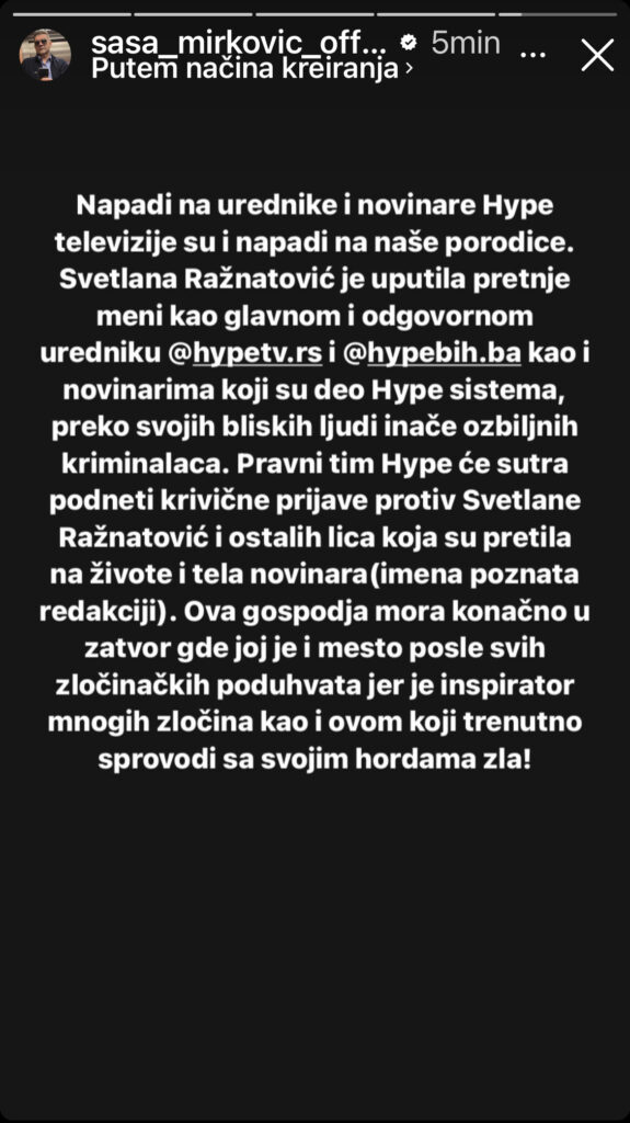 -Napadi na urednike i novinare Hype televizije su i napadi na naše porodice. Svetlana Ražnatović je uputila pretnje meni kao glavnom i odgovornom uredniku Hype televizije i Hype BiH kao i novinarima koji su deo sistema, preko svojih bliskih ljudi inače ozbiljnih kriminalaca. Pravni tim Hype će sutra podneti krivične prijave protiv Svetlane Ražnatović i ostalih lica koja su pretila na živote i tela novinara (imena poznata redakciji). Ova gospođa mora konačno u zatvor gde joj je i mesto posle svih zločinačkih poduhvata jer je inspirator mnogih zločina kao i ovom koji trenutno sprovodi sa svojim hordama zla!