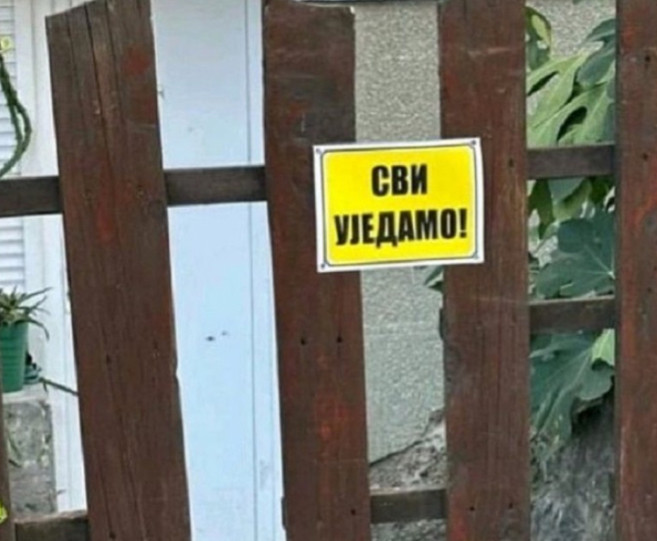 Sergej je na Instagramu objavio fotografiju jednog dvorišta sa ogradom na kojoj stoji tabla sa natpisom „Svi ujedamo“.