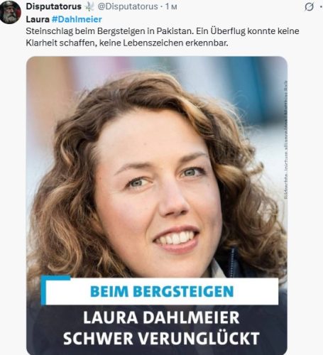 Nemačka sportistkinja je otišla na planinarsku ekspediciju na vrh Laila, planinu koja se nalazi na Karakorumu, gde su vrhovi neretko preko 6.000 metara nadmorske visine. Nemica je, kako se nezvanično saznaje nastradala zbog odrona kamenja.