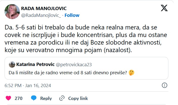 – Radno vreme od 5-6 sati bi trebalo da bude neka realna mera, da se čovek ne iscrpljuje i bude koncentrisan, plus da mu ostane vremena za porodicu ili, ne daj Bože, slobodne aktivnosti, koje su verovatno mnogima pojam (nažalost) – jedan je od tvitova, a onda je Rada nastavlja da iznosi svoje stavove: