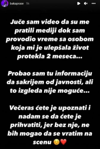 – Juče sam video da su me pratili mediji dok sam provodio vreme sa osobom koja mi je ulepšala život protekla dva meseca… Probao sam tu informaciju da sakrijem od javnosti, ali to izgleda nije moguće… Večeras ćete je upoznati i nadam se da ćete je prihvatiti, jer bez nje, ne bih mogao da se vratim na scenu – napisao je Baka Prase.