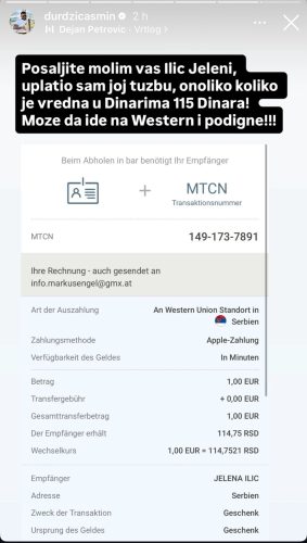 – Pošaljite molim vas Ilić Jeleni, uplatio sam joj tužbu, onoliko koliko je vredna u dinarima 115 dinara! Može da ide na Western i podigne -napisao je Asmin, a ispod priložio dokaz o uplati.