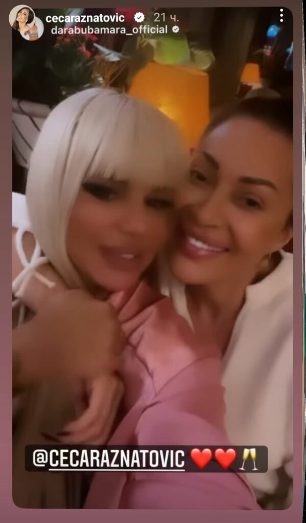 Pevačica Dara Bubamara podelila je na svom instagram nalogu snimak na kome grli i ljubi svoju koleginicu Svetlanu Cecu Ražnatović.