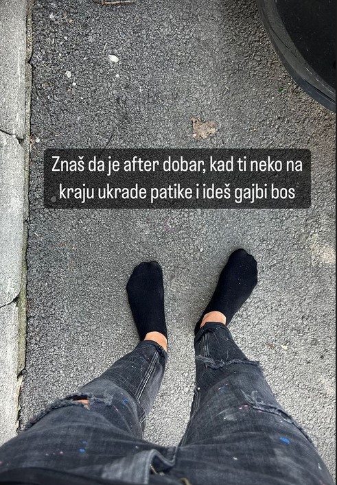 – Znaš da je after dobar, kad ti neko na kraju ukrade patike i ideš gajbi bos – napisao je Mateja i podelio fotografiju, na kojoj se vidi da je u čarapama.