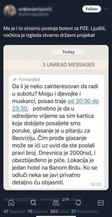 – Da li je neko zainteresovan da radi u subotu? Mogu i devojke i muškarci. Posao traje od 20:30h do 23:30h, potrebno je da u određeno vreme sa sim kartica koje dobijete pošaljete sms poruke, glasanje je u pitanju za Beoviziju. Čim prođe glasanje možete ići uz uvid da ste poslali pravi broj. Dnevnica je 2000rsd, obezbeđeno je piće. Lokacija jedan hotel na Banovom Brdu. Ko se odluči nek se javi privatno detaljno ću objasniti – glasi prepiska na jednom profilu.