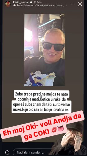 „Zube treba prati, nemoj da te za to opominje mati. Četkicu u ruke da opereš zube, znam da tebi to su velike muke. Nije bio s*ks, ali je bio oral na eks“, sočno je napisao Karić uz selfi na kojem je nasmejan.
