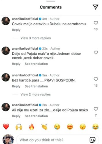 – Čovek me je ostavio na aerodromu u Dubaiju, bez kartice, para, pravi gospodin – napisala je Ana Nikolić.